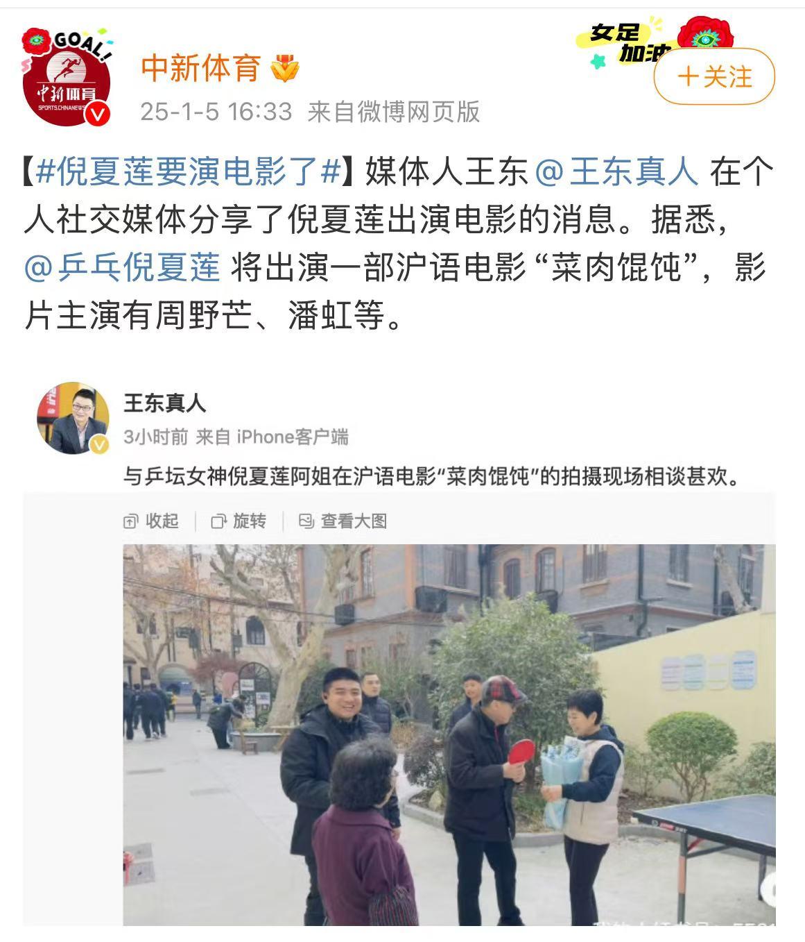 媒体人王东在个人社交媒体分享了倪夏莲出演电影的消息,并写道:“与乒坛女神倪夏莲阿姐在沪语电影‘菜肉馄饨’的拍摄现场相谈甚欢。”