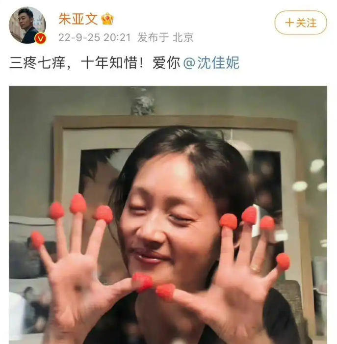 2022年9月,朱亚文曾发文庆祝与妻子沈佳妮结婚十周年纪念。