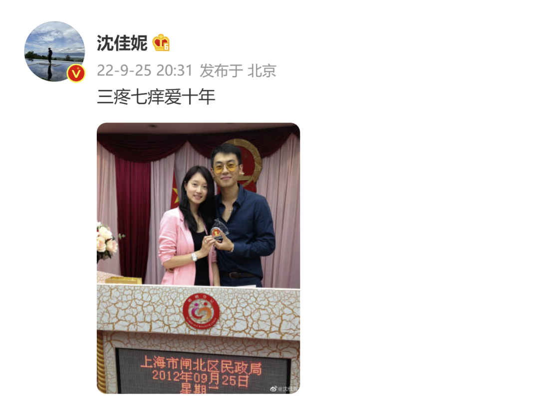沈佳妮同样晒出2012年与朱亚文结婚领证的照片,庆祝十周年。