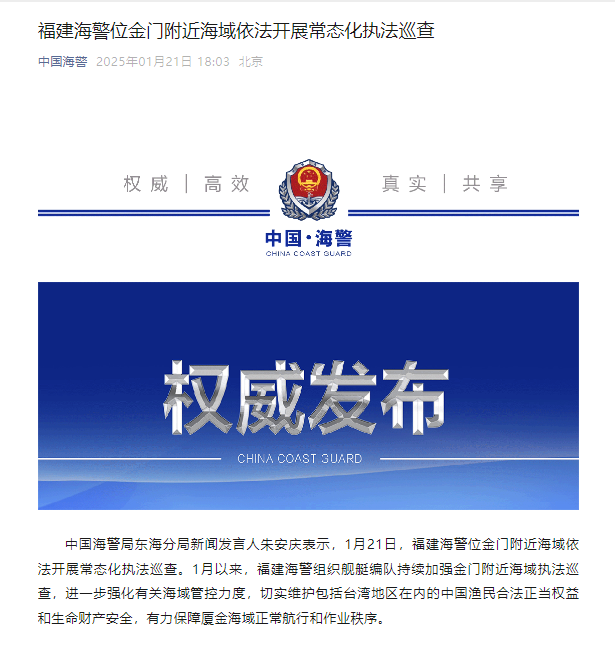 据“中国海警”微信公众号消息,中国海警局东海分局新闻发言人朱安庆表示,1月21日,福建海警位金门附近海域依法开展常态化执法巡查。1月以来,福建海警组织舰艇编队持续加强金门附近海域执法巡查,进一步强化有关海域管控力度,切实维护包括台湾地区在内的中国渔民合法正当权益和生命财产安全,有力保障厦金海域正常航行和作业秩序。