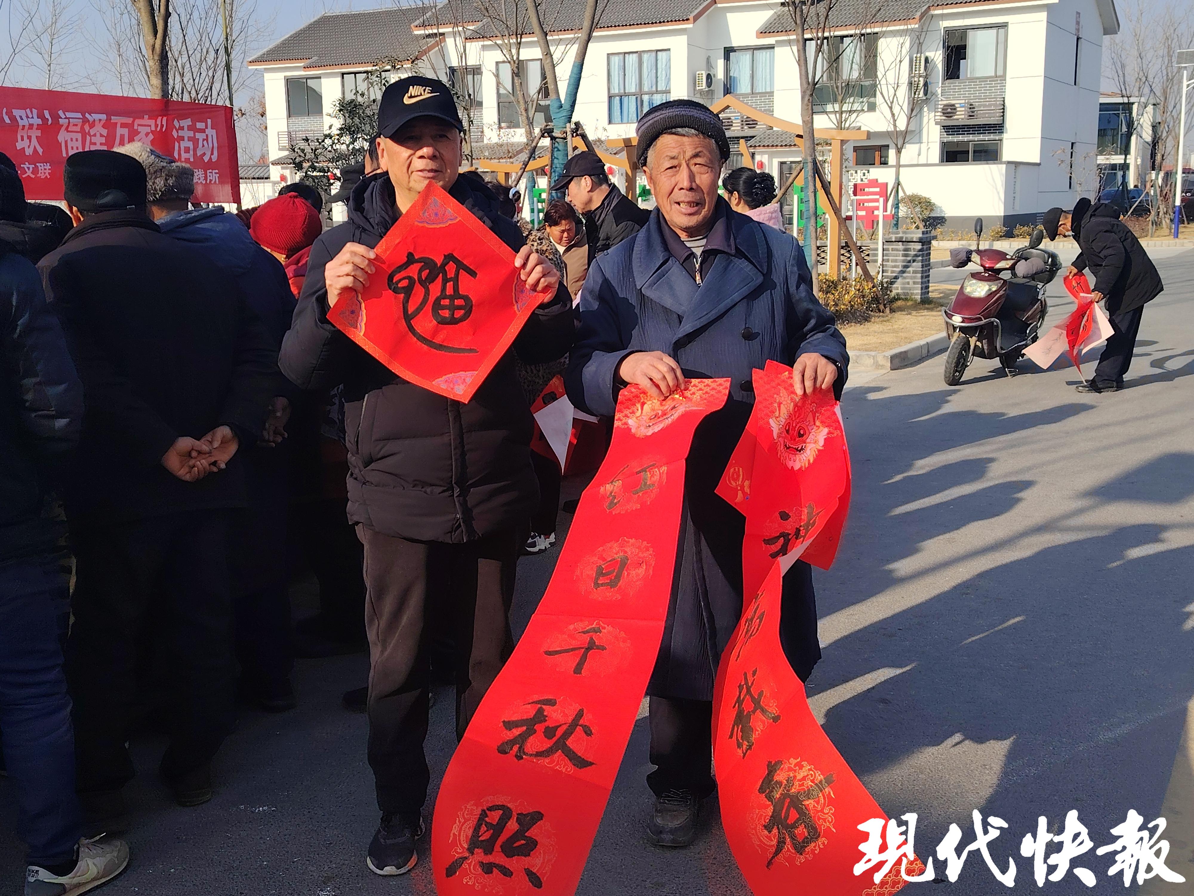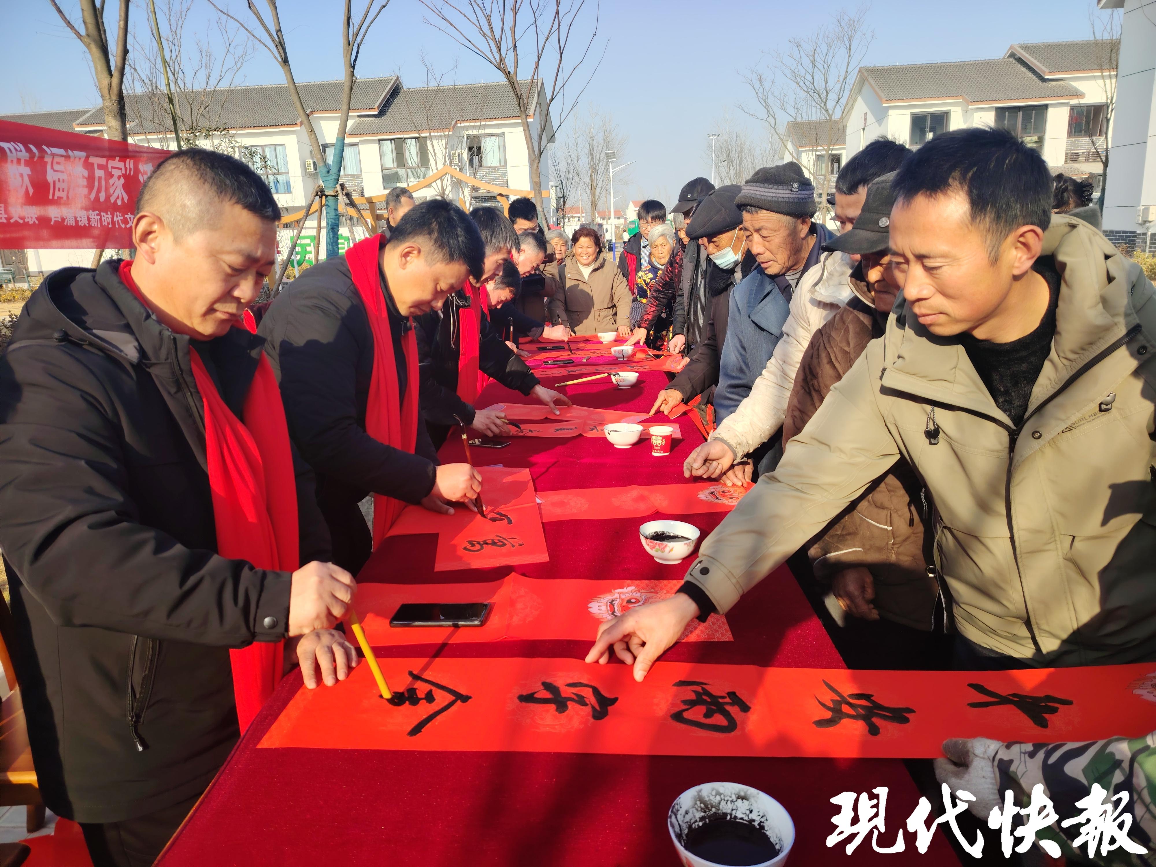 走进小区,首先映入眼帘的是家家户户门前都挂上了红彤彤的长形福字灯笼,为新居增添了几分热闹的年味。下午3时许,“‘写’‘春’意满满 ‘联’福泽万家”迎新春送春联活动举行,中国书法协会会员、盐城市书法协会副主席、阜宁县文联主席顾冬成等6位书法家为小区居民书写春联送祝福。“印刷出来的春联,一点新意也没有,看这些书法老师写出来的春联潇洒飘逸,和买的就是不一样!”沿淮小区居民张中林说。