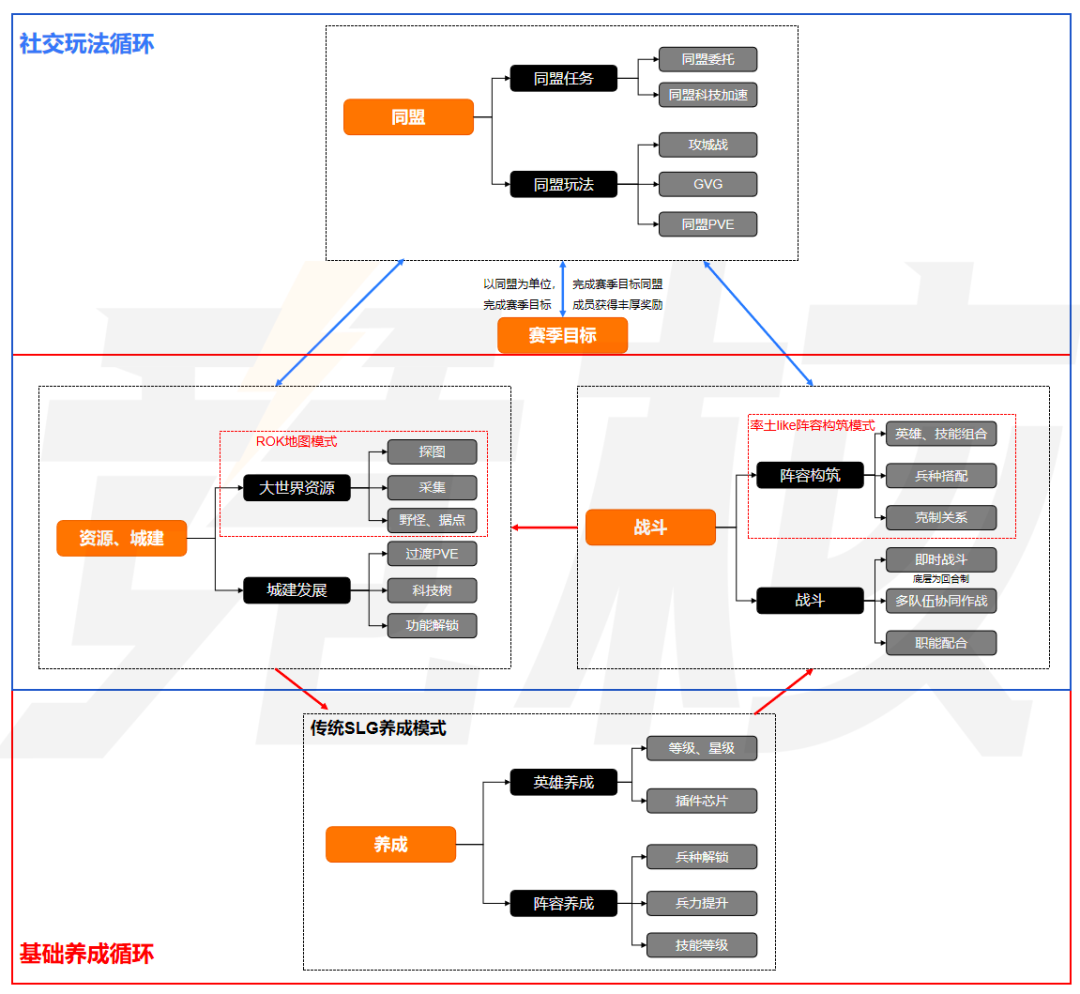 那么也就衍生出一个问题,也是笔者在讨论SLG品类中反复讨论的问题,那就是我们是否能够通过玩法融合的形式(例如ROK+率土like)来解决社交生态以及题材掣肘的两个痛点?