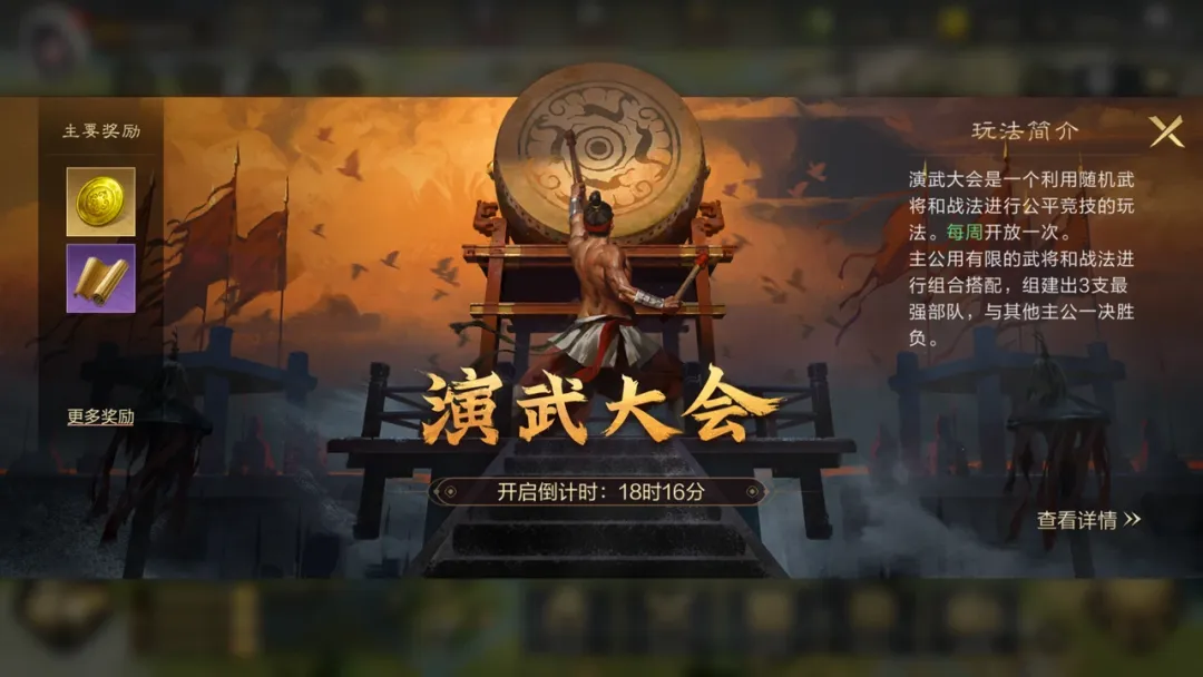 除此之外,另一个玩法融合的做法,则是将普适性周边玩法的引入到游戏内,来为更多普通玩家提供社交彰显的空间,其中的典型便是《三谋》的“演武大会”。