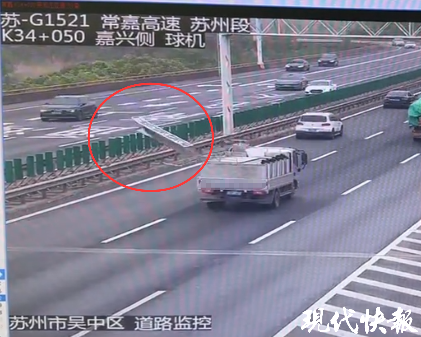 现代快报讯(通讯员 周力 季强 记者 高达)4月12日,苏州发布大风警报,部分地区出现了10至11级大风。当天下午,苏州绕城高速安畅二大队监控室内骤然响起警报,视频画面显示,13时07分,在嘉常高速34k吴淞江出口路段,一辆载满金属架的货车突遭强风袭击,一阵瞬时的大风将整批金属架瞬间掀起,金属架构件霎时间飞越中央隔离带,散落在对向车道的应急车道及第三车道上。万幸的是,此时未造成车辆碰撞与人员伤亡。