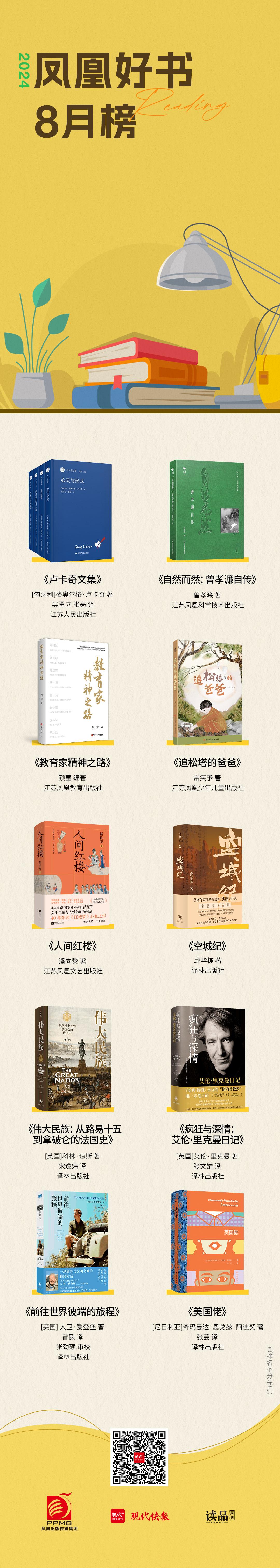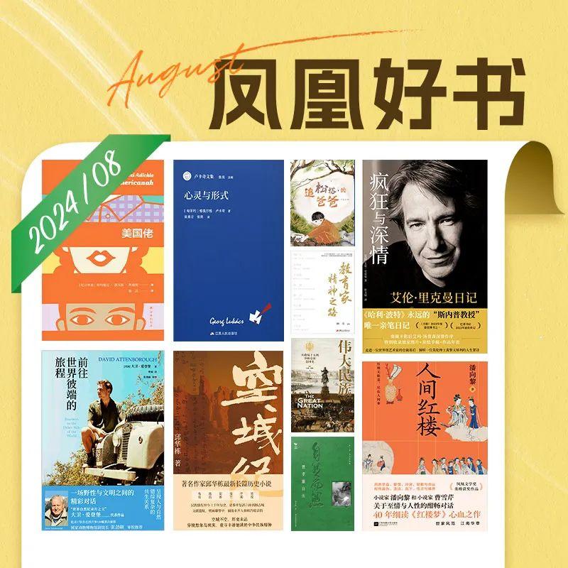 秋意渐浓,雨打芭蕉。八月“凤凰好书”榜单如约而至,共有10种图书入选。《卢卡奇文集》让读者一睹卢氏犀利的文风和深邃的思想,《教育家精神之路》探寻知名教育家的精神根脉,为广大教育工作者树立“行动坐标”;《自然而然:曾孝濂自传》讲述中国植物科学画界“活化石”曾孝濂的艺术人生,《前往世界彼端的旅程》则是当代最重要的自然纪录片制片人、博物学家大卫•爱登堡的珍贵记录;《伟大民族:从路易十五到拿破仑的法国史》记录了一个强大的王朝走向迟暮又重获新生的历史,《美国佬》站在美国与尼日利亚两块大陆上审视彼此;《人间红楼》正本清源、全方位检视这部中国文学经典之经典的小说艺术,《空城纪》外表是活色生香的故事,内里是有趣生动的西域历史文化;《疯狂与深情:艾伦·里克曼日记》呈现“斯内普教授”优雅而狡黠、犀利而深情的一面;《追松塔的爸爸》展示东北原始森林的美丽风光与风俗民情。本期榜单既是一次思想交锋,也是一场艺术盛宴,祝读者诸君在阅读中发现世界的广阔与深邃。